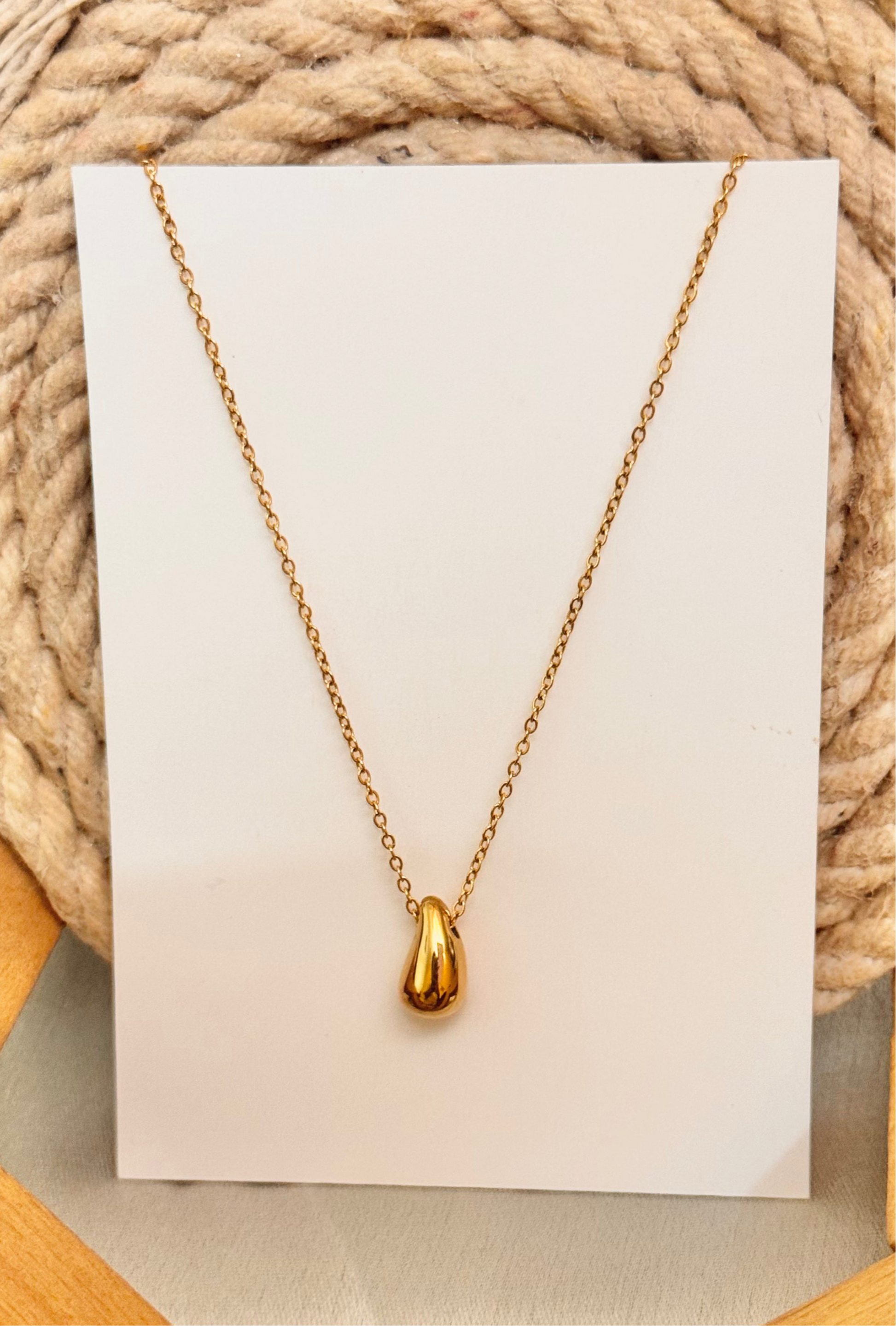 This elegant gold-toned necklace features a sleek, teardrop-inspired pendant
